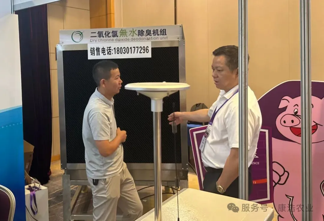 在展会现场,“二氧化氯無水除臭机组”吸引了众多参会者驻足参观。养猪场负责人、行业专家纷纷对这款新品表现出浓厚兴趣,详细询问产品性能、使用方法和价格等问题。